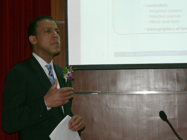 講座分兩部分,第一部分,哈瑞森博士簡單介紹了自己的家庭背景、求學(xué)經(jīng)歷及美國的法學(xué)教育和法律職業(yè)情況,語言風(fēng)趣幽默,具有親和力。