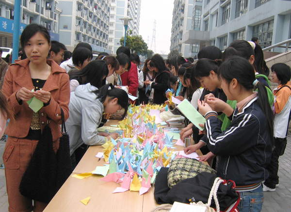 盈盈千紙鶴,悠悠祝福深。千紙鶴在人們的心目中是傳達(dá)美好心聲和祝福的吉祥物,本次千紙鶴征集活動(dòng)以此為載體,將征集的紙鶴贈(zèng)送給人文學(xué)院聯(lián)系的我省兩個(gè)新農(nóng)村建設(shè)的示范村。在校黨委宣傳部、校團(tuán)委的大力支持下,為期一周的現(xiàn)場(chǎng)氣氛熱烈,同學(xué)們紛紛憑借自己巧妙的雙手加入了此次活動(dòng),超額實(shí)現(xiàn)了征集2006只千紙鶴的目標(biāo),充分反映了我校大學(xué)生心系社會(huì)的熱情。