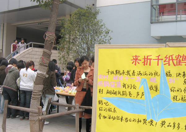 2006年3月27日,中國(guó)計(jì)量學(xué)院“兩課所”在新老食堂門口舉行了為期一周的千紙鶴征集活動(dòng),此次征集活動(dòng)以“打造新農(nóng)村,解讀十一五規(guī)劃”為主題,面向全校師生征集千紙鶴,將量院學(xué)子關(guān)心時(shí)事、參與新農(nóng)村建設(shè)的熱情以千紙鶴的形式傳遞給我省的廣大農(nóng)村。