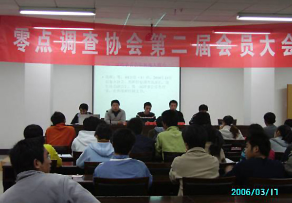 零點調查協會成立于2003年,是集實踐性、思想性、學術性為一體的以開展調查活動為主的校級學生社團,自協會成立以來結合校園文化生活已開展二十余項調研活動。協會多次組隊參加校內外各項比賽,曾獲第三屆管理學術研討會一等獎、三等獎以及第六屆管理案例分析大賽二等獎,并于2005年四月榮獲校四星級學生社團榮譽稱號。在注重活動質量的同時,零點調查協會一直致力于管理的制度化、規范化建設,定期召開會員大會,在組織開展活動的同時注重培養干事的綜合能力等。第二屆會員大會的順利召開為今后零點調查協會的進一步發展奠定了良好的基礎。