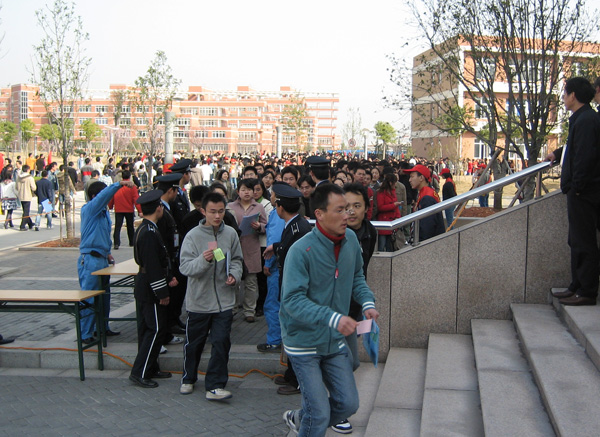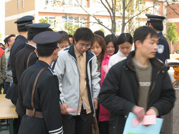 由我校承辦的浙江理工大學,杭州電子科技大學,中國計量學院三校2006年畢業生春季就業招聘會,三月十六日圓滿結束,共有飛機制造、通訊產業等一百八十余家省內外用人企業進場招聘,應聘學生超過二萬人。    為了確保此次招聘會有序、安全舉行,保衛處多次開會和現場勘視,明確分工,并將情況及時與月雅河派出所,下沙公安分局、經文保大隊、治安大隊,下沙交警大隊報告,分局治安大隊經文保大隊及月雅河派出所,下沙交警大隊均親臨現場督導,我處多名保衛干部和40名校衛隊員早七點四十分即進場布置,團委組織了40名學生志愿者參加維護秩序,同時考慮進場時段流量較為集中,根據下沙公安分局和月雅河派出所現場指導和要求為確保安全,校保衛處及時與兄弟院校溝通,并取得了他們的支持,電子科大和司法警官學院各增援30名隊員和學員,保證了此次招聘會順利進行秩序井然,安全保障有力,受到學校和與會用人企業的一致好評。