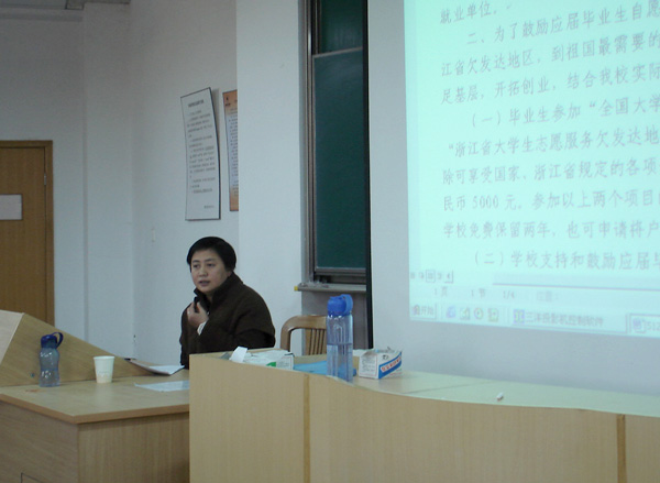 唐六一副書記首先肯定了同學們在本學期內的表現,通報了各班級截至當前的簽約情況。她鼓勵各班級繼續保持高漲的就業氛圍,在就業過程中發揮集體的優勢,互相鼓勵,互相幫助。她詳細介紹了學校和分院對畢業生就業所做的工作和服務,如在國家和浙江省公務員考試中,中國計量學院是在杭高校中唯一派車送考的學校;機電工程學院近期舉辦了天津儀表集團、怡得樂電子(杭州)有限公司、浙江普田電器公司等數場專場招聘會等。針對目前尚無實習或接收單位的部分畢業生,特別提出了希望,希望他們樹立信心,主動出擊,隨行就市,服務基層。最后,她鼓勵考研的同學堅持到底,并預祝他們取得好的成績。