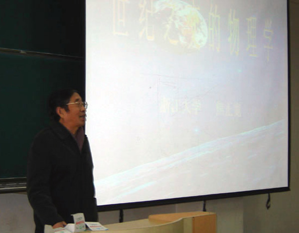 浙江大學的凝聚態物理方面的資深專家焦正寬教授應邀也為各年級的學生做了?D?D世紀之交的物理學的精彩報告。焦正寬教授從物理學的起源到目前物理學的飛速發展中存在的一些重要發現和探索展開了生動的講解,使同學們對物理學的發展里程有了一定的了解。在報告之中,焦教授利用某些重大的發現和發明向與會的教師和學生傾授了一些科學的學習和科研的方法以及技巧。同時焦正寬教授就自己在凝聚態物理幾十年的研究經歷,介紹了目前熱門的高溫超導體,納米磁性材料、受控熱核聚變等領域的問題。焦正寬詼諧的言語以及生動的舉例博得了同學們陣陣的掌聲和笑聲,報告現場氣氛非常熱烈。同學們通過聽取報告,深刻體驗到學習物理學的重要性,真正理解了物理學基本上支撐著目前理工科學科領域,可以說沒有物理學就沒有現代的文明社會。