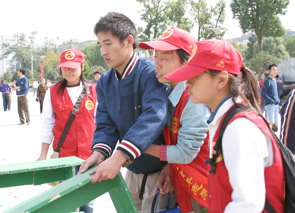 今天的省人民大會堂熱鬧非凡,來自各界的文藝人士、表演團體很早就把會場裝扮得如歡樂的海洋。我們的志愿者并未流連于這歡樂的氣氛,很快進入了工作狀態(tài)。“女生把主席臺上的桌椅擺放整齊,擦拭干凈。男生把發(fā)放給觀眾的資料袋裝上飲料,在位置上擺好……”隨著負責人的工作安排,志愿者們很快便行動起來,忙的不亦樂乎。空曠的廣場上秋風襲來,不禁讓人打起了哆嗦。女生不時朝手呵著熱氣,男生則一次次穿梭于主席臺上各排座位之間。很快,凳子就都被擦干,擺放整齊,而資料袋也一個個在位置上躺好,靜候觀眾們的到來。