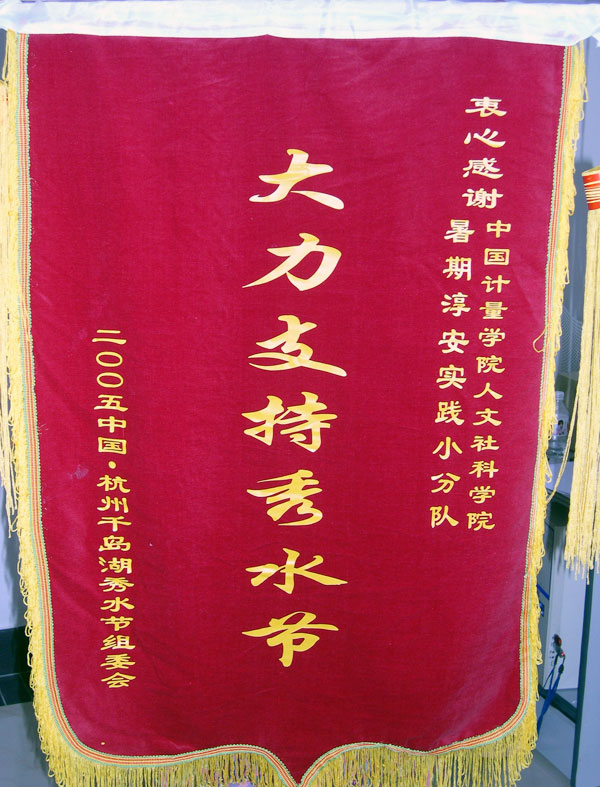 9月15日下午,人文社科學院收到了淳安千島湖“秀水節”組委會贈送的錦旗。2005?中國杭州千島湖“秀水節”組委會代表為了感謝人文學院赴淳安暑期實踐小分隊對秀水節的大力支持和出色貢獻,特從淳安縣趕來用錦旗來表達對中國計量學院人文學院的誠摯謝意。