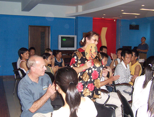 于是,同學(xué)們“反客為主”,積極提問(wèn),有心“刁難“,但外教也都游刃有余、對(duì)答如流。活動(dòng)中,Laurel繪聲繪色的介紹南非食品,勾起了同學(xué)們陣陣食欲;Leslie講述了他多年的外教史,使同學(xué)們了解了其他高校學(xué)生學(xué)習(xí)英語(yǔ)的方法。當(dāng)Kim表達(dá)了她對(duì)杭州有如家的感覺(jué)時(shí),更是贏得了同學(xué)們的熱烈掌聲,如同迎接遠(yuǎn)歸的家人一般。