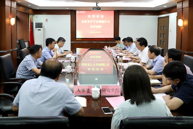 6月25日上午,省教育廳黨委委員、副廳長于永明在高教處處長呂華和副處長藍鄧駿的陪同下來校調研指導學科建設工作。校黨委書記張土喬,校長宋明順,副校長俞曉平、金尚忠和黨辦校辦、發規處、教務處、科技處、研究生院、人事處負責人參加調研交流會。