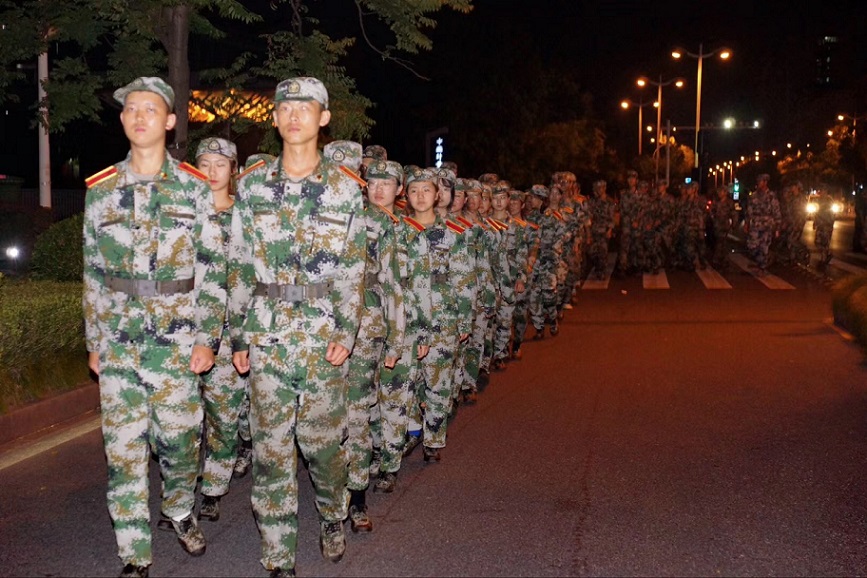 9月18日晚上22:00,隨著一聲急哨的響起,所有軍訓隊員緊急集合,迅速在集合地整隊完畢,拉練正式開始。拉練內容為:從生活區出發,徒步環校一周,最后回到生活區。同學們雖然才剛剛完成一天的訓練任務,但緊急集合的哨聲又讓他們充滿干勁,整齊劃一的隊伍在晚23:45(時間)圓滿完成了拉練任務。為了保障學生們夜間訓練的安全,體軍部聯合保衛處、后勤、校醫院等部門在沿途馬路和路口上安排了多名保安人員梳理交通、宿舍樓安排宿管阿姨為學生開放出入、定點醫生保障學生的突發醫療狀況。體軍部黨政領導跟隨拉練隊伍一道,并在生活區路口協助完成部隊橫穿馬路,為隊伍排除路上的障礙。