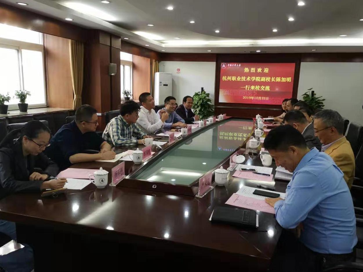 10月22日上午,杭州職業(yè)技術(shù)學(xué)院副校長陳加明一行來我校交流。副校長金尚忠會見了陳加明副校長一行。教務(wù)處、計(jì)財(cái)處、學(xué)生處、機(jī)電工程學(xué)院等相關(guān)負(fù)責(zé)人參加了座談會。