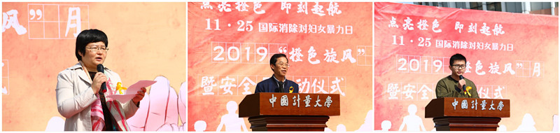 “今天,我們聯(lián)合中國計量大學(xué)共同舉辦“橙色旋風(fēng)”進(jìn)校園活動,希望將拒絕暴力的意識扎根校園,鼓舞朝氣蓬勃的青年參與到抵制暴力的浪潮當(dāng)中,動員、培養(yǎng)新一代反家暴的踐行者、傳播者、引領(lǐng)者。”陳遼敏在發(fā)言中強(qiáng)調(diào)家園、校園是每個人心中溫暖的港灣。抵制家庭暴力,需要所有人共同的努力。“同學(xué)們,你們是時代進(jìn)步和社會發(fā)展的生力軍,世界是屬于你們的,而作為學(xué)校,作為老師,我們有義務(wù)也應(yīng)當(dāng)肩負(fù)起保護(hù)你們健康成長,護(hù)你們安全的責(zé)任。拒絕暴力,不做旁觀者,愿你我都被這個世界溫柔相待,安全相伴。”陳永良在發(fā)言中殷切地說到。
