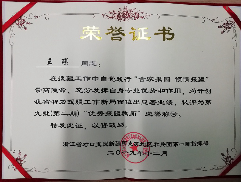 日前,根據浙江省援疆指揮部《關于開展第九批第二期優秀援疆人才評選表彰的通知》(浙援疆指〔2019〕25號),浙江省援疆指揮部進行了第九批(第二期)優秀援疆人才的評選。我校法學院(知識產權學院)援疆教師王璟,獲得了第九批(第二期)“優秀援疆教師”榮譽稱號。