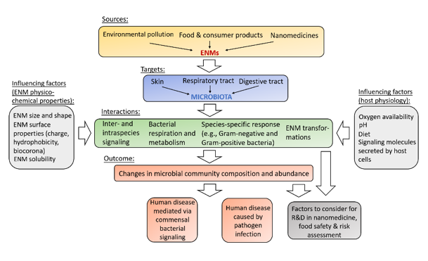 人工納米材料(ENMs)具有獨特的理化特性,在食品、個人護理產品、農業、生物醫學等領域已經得到廣泛應用,導致人類和環境對ENMs的暴露逐漸增加。通過食物和個人護理品進入人體的ENMs不可避免地影響對人體健康和疾病起重要作用的共生微生物。但目前對于ENMs與微生物的相互作用機制及其潛在效應的研究還處于初始階段,嚴重限制了ENMs的安全設計、風險評估及應用。近期,中國計量大學環境與健康科學研究院郭良宏團隊成員在ENMs與微生物相互作用的機制研究方面取得重要成果。