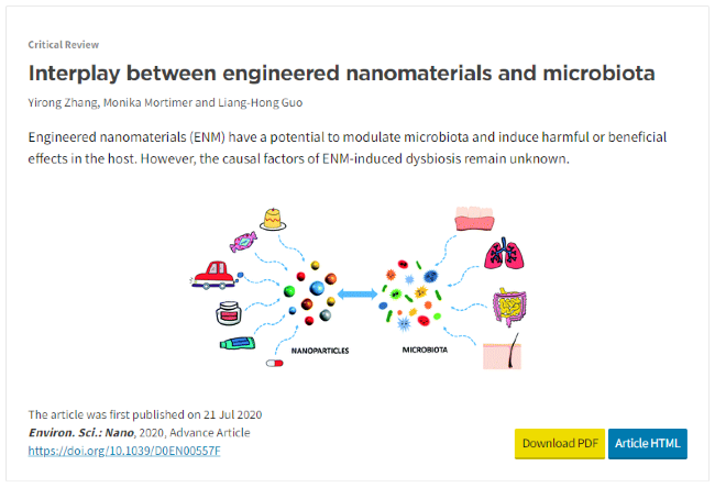 基于近年來的研究基礎,團隊成員張伊榕、Monika Mortimer、郭良宏共同撰寫了題為“Interplay between Engineered Nanomaterials and Microbiota”的綜述,今年7月在環境科學高影響力期刊Environmental Science: Nano 上發表