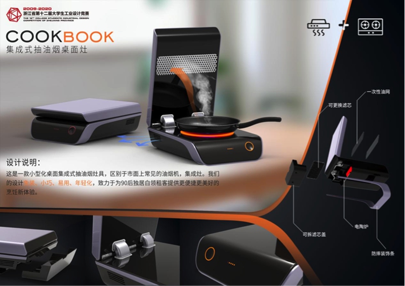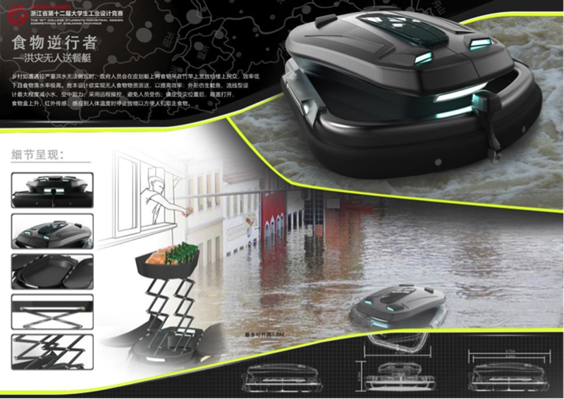 獲獎作品“cookbook集成式抽油煙桌面灶”是一款小型化桌面集成式抽油煙灶具,區別于市面上常見的油煙機集成灶,此款設計免裝,小巧易用,年輕化,致力于為年輕90后獨居白領租客提供更便捷,更美好的烹飪新體驗;“食物逆行者——洪災無人送餐艇”是一款無人洪災送餐艇產品。鄉村如遭遇較嚴重洪水無法做飯時,政府人員會在皮劃艇上將食物吊在竹竿上發放給樓上民眾,效率低下且食物落水率極高。故本設計外形仿生鯰魚,流線型設計最大程度減小水、空中阻力;采用遠程操控,避免人員受傷;確定受災位置后,箱蓋打開,食物盒上升,紅外傳感,感應到人體溫度時停止放縮以方便人們取走食物。