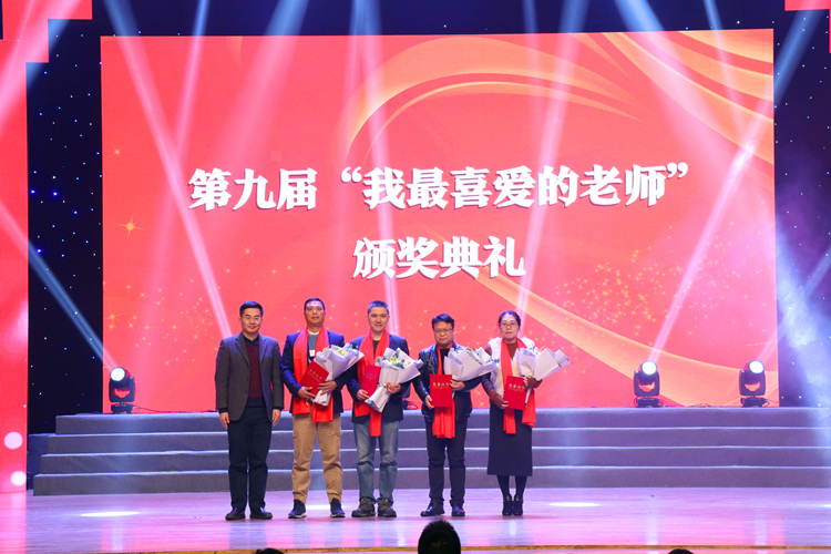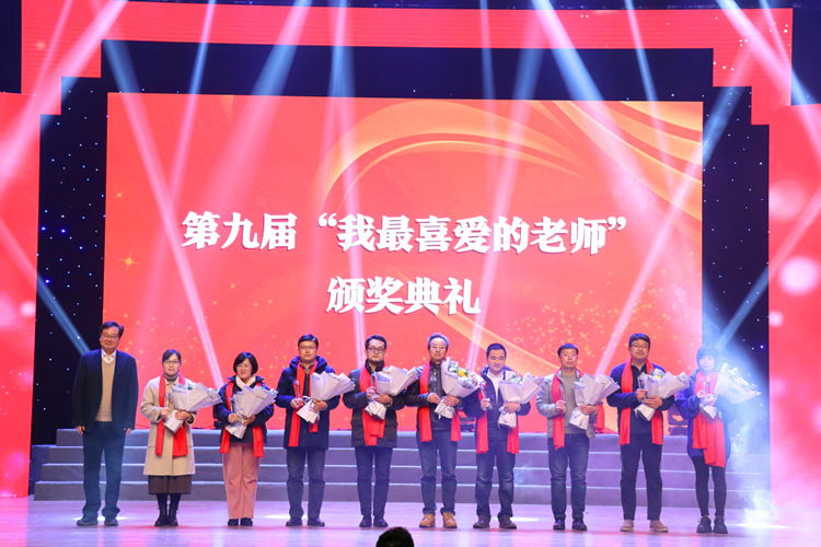 晚會開場后首先舉行第九屆“我最喜愛的老師”頒獎儀式。為營造尊師重教的良好氛圍,增強同學們的主人翁意識,增進廣大同學與老師之間的感情,校學生會于近期組織開展了第九屆“我最喜愛的老師”評選活動,經過各教學單位推薦和黨組織同意,組委會進行資格審查,綜合候選老師公開課學生評審評分與任課班級抽樣評分并進行獲獎公示等環節,最終產生了“我最喜愛的老師”10名,單項獎7名。程剛為“我最喜愛的老師”獲得者頒獎,王斌銳為“我最喜愛的老師”單項獎獲得者頒獎,學生代表向獲獎教師獻花致敬。