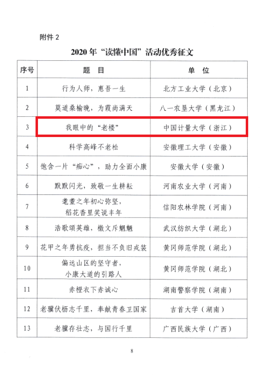 經過激烈的角逐,我校理學院18應物1班劉雨萱同學的《我眼中的“老樓”》榮獲2020年“讀懂中國”活動優秀征文;中國計量大學關工委榮獲2020年“讀懂中國”活動優秀組織獎。