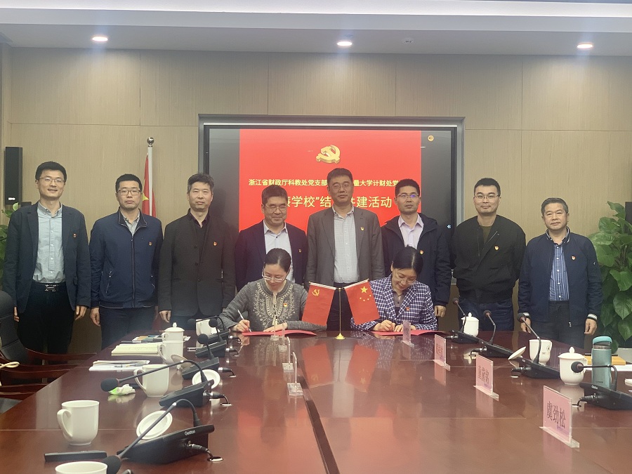 最后,在葛洪良副校長、虞勁松副處長等領導和支部黨員代表共同見證下,浙江省財政廳科教處黨支部書記童黛銘與中國計量大學計財處黨支部書記郭慧麗共同簽署了支部“清廉學校”結對共建協議書。在“十四五”期間開展黨支部結對共建活動,從強化學校預決算管理、加強制度建設和績效管理共同推進“清廉學校”建設。