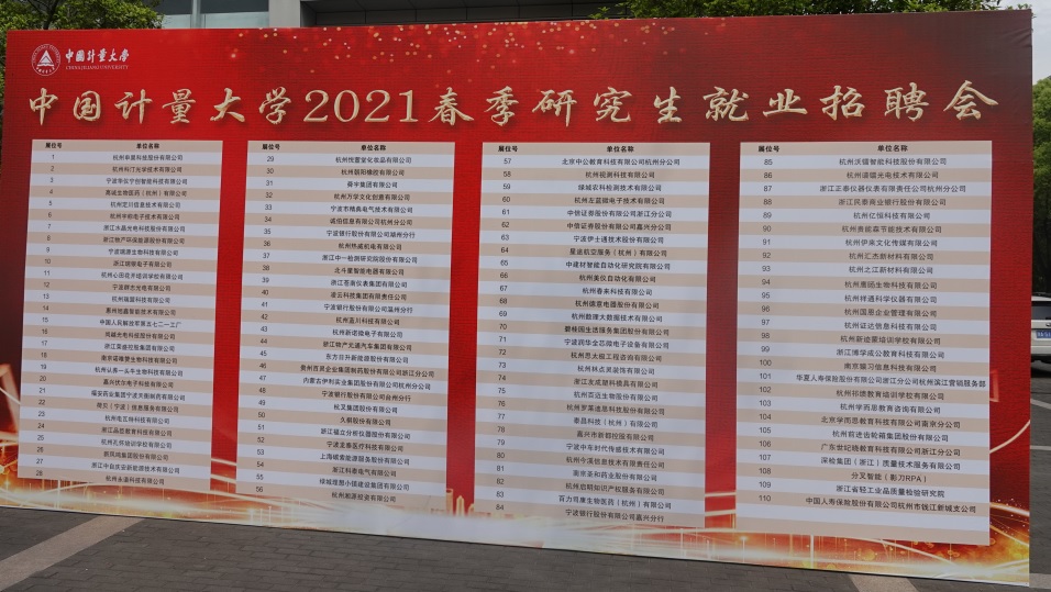 為營造良好的研究生就業氛圍,搭建用人單位與畢業生之間的雙選平臺,促進2021屆畢業研究生充分就業。在相關部門和各學院的大力支持下,4月21日我校在天健體育館舉辦了“2021年中國計量大學春季研究生就業招聘會”。