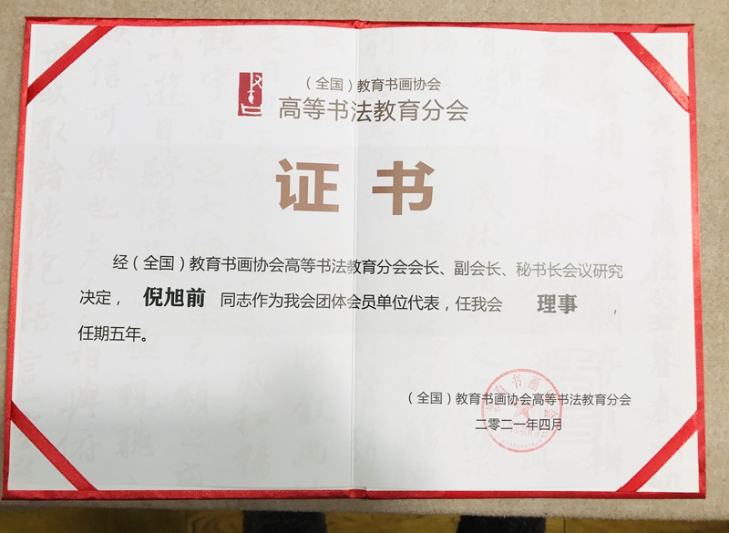 據《(全國)教育書畫協會高等書法教育分會關于2020-2021年度理事單位授牌的通知》文件,經(全國)教育書畫協會高等書法教育分會會長副會長秘書長會議研究,授予中國計量大學藝術與傳播學院為理事單位,藝術與傳播學院倪旭前教授為該會理事。