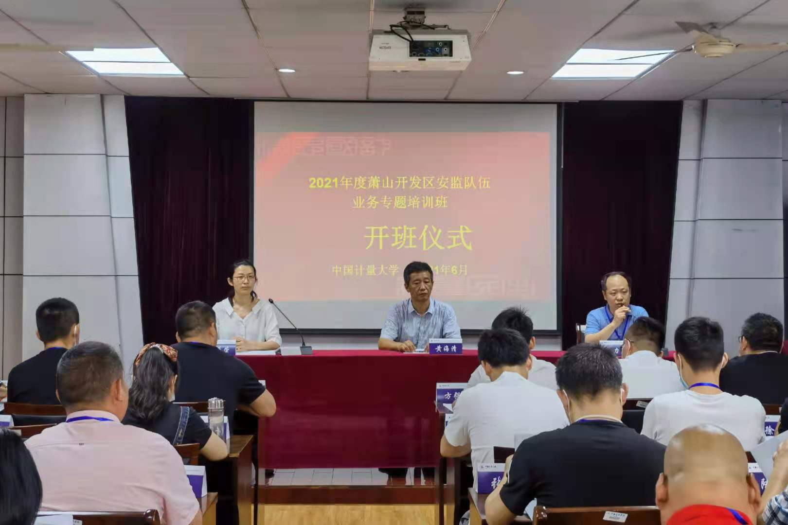 6月8日上午,蕭山經濟開發區2021年度安監隊伍業務專題培訓班在我校舉辦。中國計量大學繼續教育學院院長黃海清,蕭山開發區經濟發展局安全環保科科長瞿力斌出席開班儀式。開班儀式由中國計量大學繼續教育學院培訓中心副主任劉亞榮主持,來自蕭山經濟開發區安監隊伍和企業安全負責人共46名領導與學員參加了本次培訓。