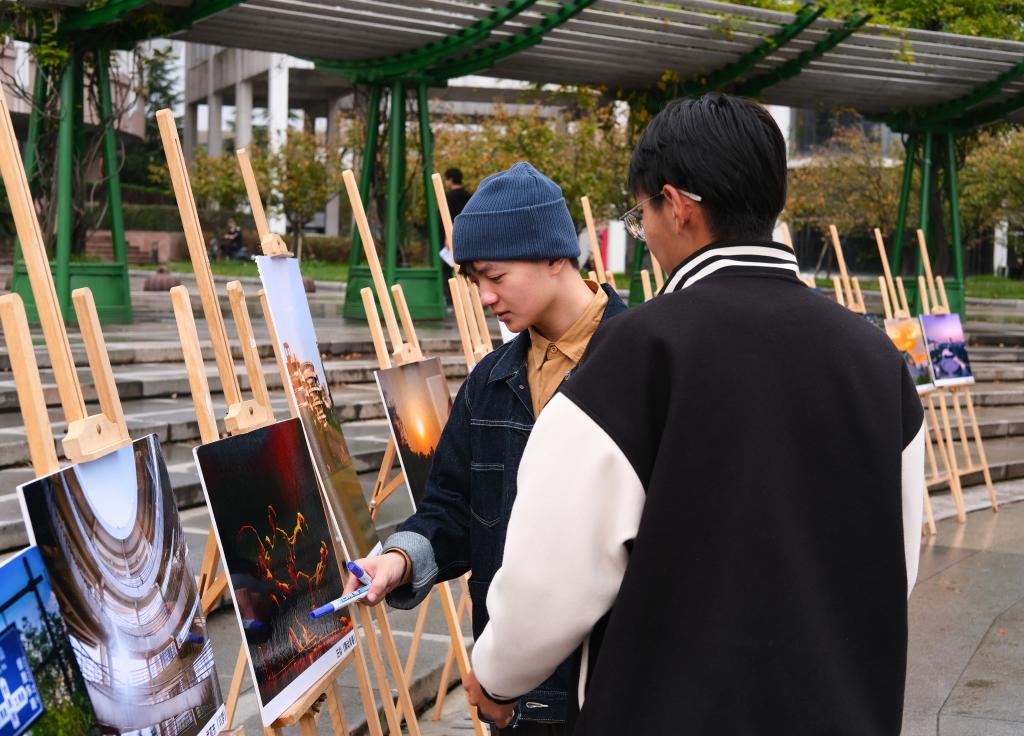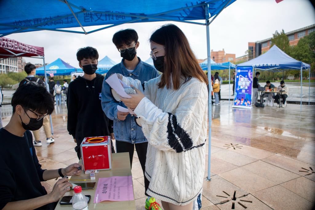 本屆記者節活動內容豐富,廣場中不僅展示了許多優秀的攝影作品,還有模仿新聞主播讀繞口令、正話反說、平衡行走、趣味答題等游戲,現場氣氛活躍。游戲獲勝的同學即可獲得對應的印章,集齊一定數量的印章可以兌換量量玩偶、大鵝玩偶、量量盲盒等獎品。
