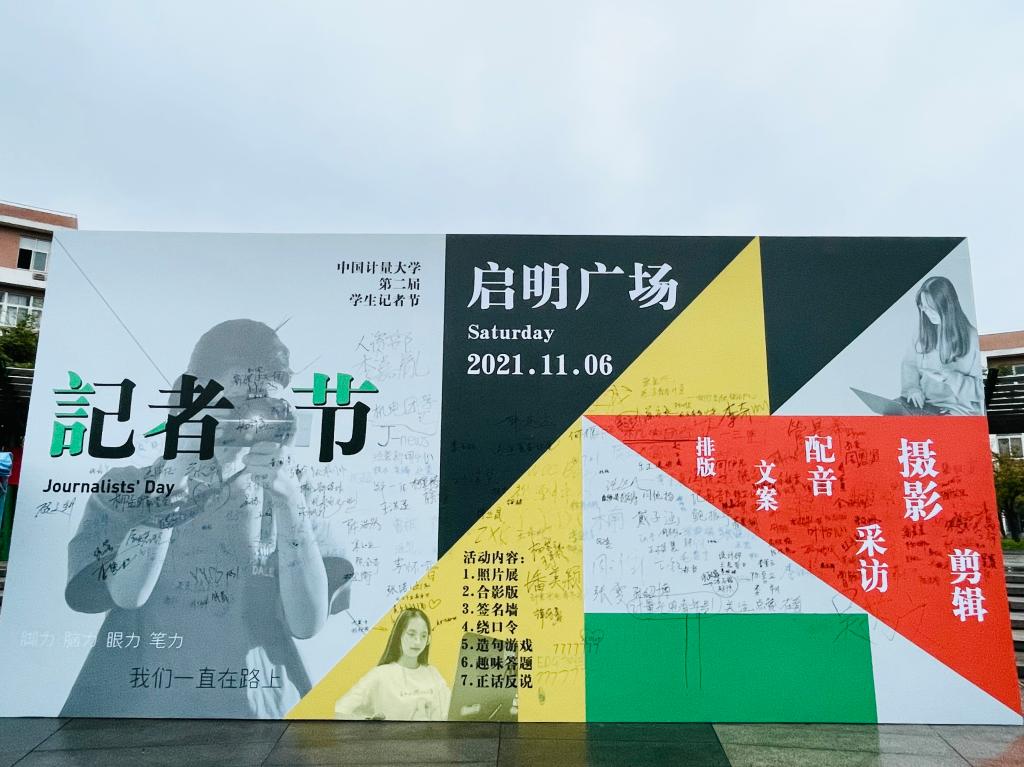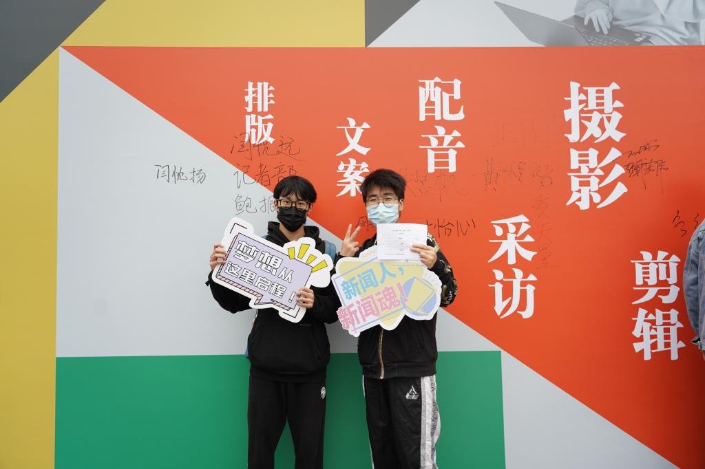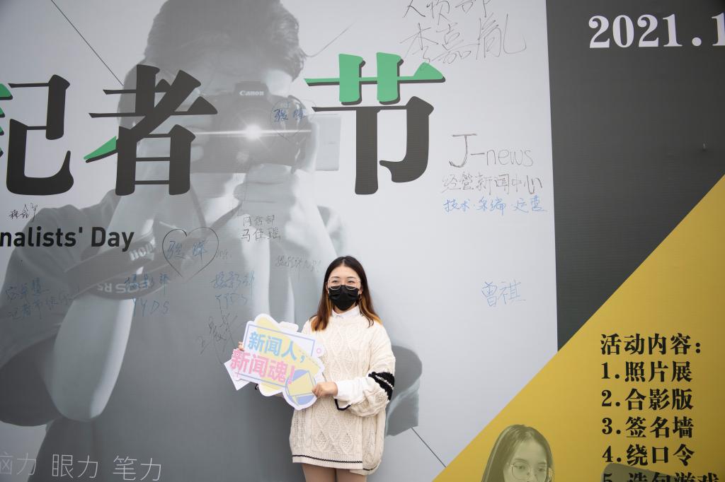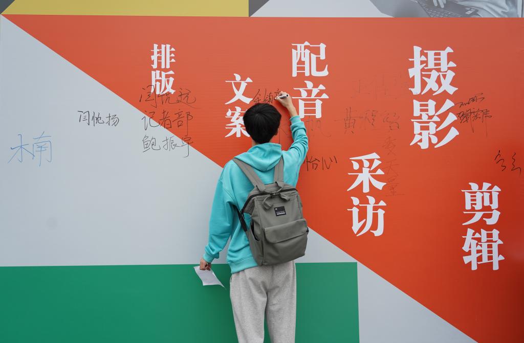 “聞汛而起,視潮而動,逐浪而來,記者節快樂!”“使命在肩上,奔跑在路上!”啟明廣場兩側的橫幅提前宣傳預熱了本次活動。同學們在巨大的噴繪上簽下自己的名字,紛紛拿著“新聞人,新聞魂”“記者節,我們的節日”等手牌在簽名墻前拍照留念。