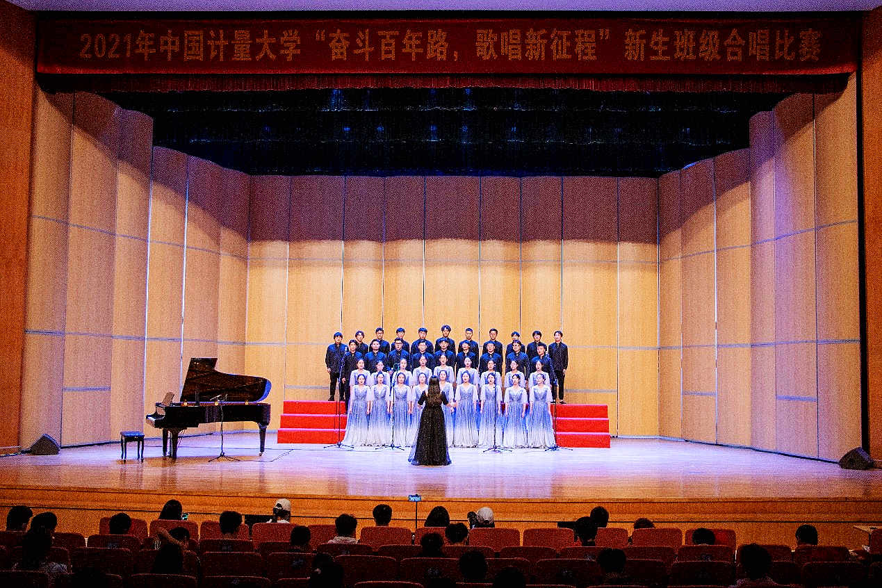 本屆新生班級合唱比賽初賽在十五個學院分別舉行,各學院遴選出一個新生班級進入決賽,決賽中每個參賽班級演唱中國計量大學校歌和一首紅色主題自選曲目。經過近一個月的精心準備,各參賽班級服裝統一,隊列整齊,精神飽滿,以昂揚向上的青春姿態,用嘹亮的歌聲贊頌百年征程風華路。在樂音交織中,通過激烈的角逐,藝術與傳播學院21廣告1班獲一等獎,光學與電子科技學院21光電1班和材料與化學學院21材料4班獲二等獎,繼續教育學院21綜合班、法學院21法學類3班和人文與外語學院21公共管理類2班獲三等獎,光學與電子科技學院和繼續教育學院獲優秀組織獎。
