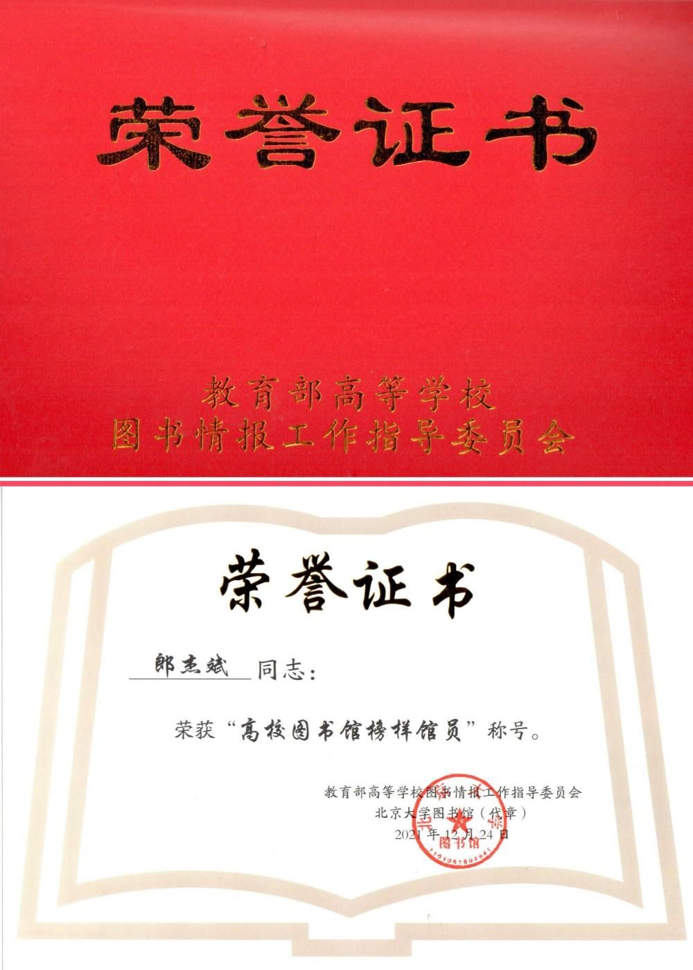近日,我校圖書館收到教育部高等學校圖書情報工作指導委員會(簡稱“教育部高校圖工委”)的頒獎證書,我校郎杰斌研究館員獲評“高校圖書館榜樣館員”榮譽稱號。