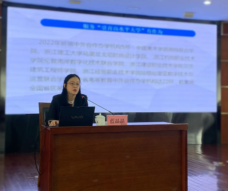 10月14日下午,學校國際化工作會議在明德樓B6會議室召開。浙江省教育廳國際處(港澳臺辦)處長藍晶晶應邀出席會議并作題為《凝聚共識 踔厲奮發(fā) 建設教育對外開放高質(zhì)量發(fā)展高地》的專題報告。會議由副校長俞曉平主持,各學院、部門分管外事工作領導和外事秘書以及國際處、國際教育學院全體人員參加。
