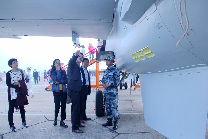 參觀交流團觀摩了空軍戰機、機載武器、地勤設備,觀看了軍體拳演練和中國空軍宣傳片,并參觀“醒村”愛國主義教育基地。在停機坪,我校師生在部隊官兵的講解下,近距離觀察了展示的JH-7型殲擊轟炸機(又稱“飛豹”攻擊機),還登上舷梯觀摩了飛行員座艙。部隊講解員向大家依次介紹了飛機的機體結構、武器掛架、起落架、水平與垂直尾翼、發動機、機炮等組件。在武器展示區,通過部隊講解員的介紹,師生對“飛豹”的機炮炮彈、火箭彈、空對空導彈、空對艦導彈、空對地導彈、反輻射導彈、制導炸彈等一系列武器有了初步的認識。在地勤裝備區,低矮底盤的拖車、架起高舷梯的登機車等形態各異、功能完備的各類地勤保障車輛使師生們大開眼界。在一旁,部隊官兵的軍體拳演練讓大家盡情領略了鐵骨硬漢的風采。隨后,參觀交流團在部隊講解員的引導下,進入“醒村”愛國主義教育基地,追溯革命先驅的中國航空之夢,重溫抗戰先烈的碧血長空情懷。
