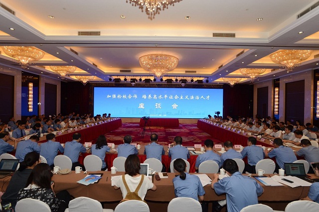 近日,浙江省人民檢察院與17家法學院校在杭州舉行“加強檢校合作 培養高水平社會主義法治人才”座談會。最高人民檢察院黨組成員、副檢察長李如林,中國法學會副會長張文顯,以及中央政法委、教育部等相關領導,相關法學院校領導及掛職法學專家參加座談會,座談會由浙江省檢察院黨組書記、檢察長賈宇主持。我校黨委副書記陶偉華參加座談會。