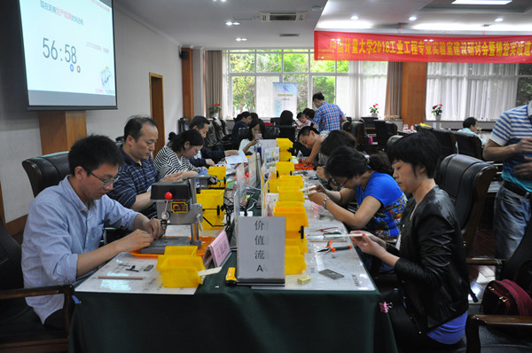 隨著國內企業的產業升級,企業對于工業工程、精益生產的人才需求不斷增長,對工業工程人才實踐能力的要求越來越高。如何建設好實驗室,為學生提供更好的實踐教育資源成為全國高校工業工程專業面臨的普遍問題。為此,2018年6月2日 ,我校舉辦了2018工業工程(IE)專業實驗室建設研討會,以實戰體驗的方式讓各高校同儕體驗了我校工業工程專業的特色實踐教學模式“精益實戰道場”。來自哈爾濱工業大學、南京航空航天大學、東北林業大學等全國各地二十所高校的三十余名工業工程專業教師代表以及特邀企業代表,共計四十余人參加了活動。