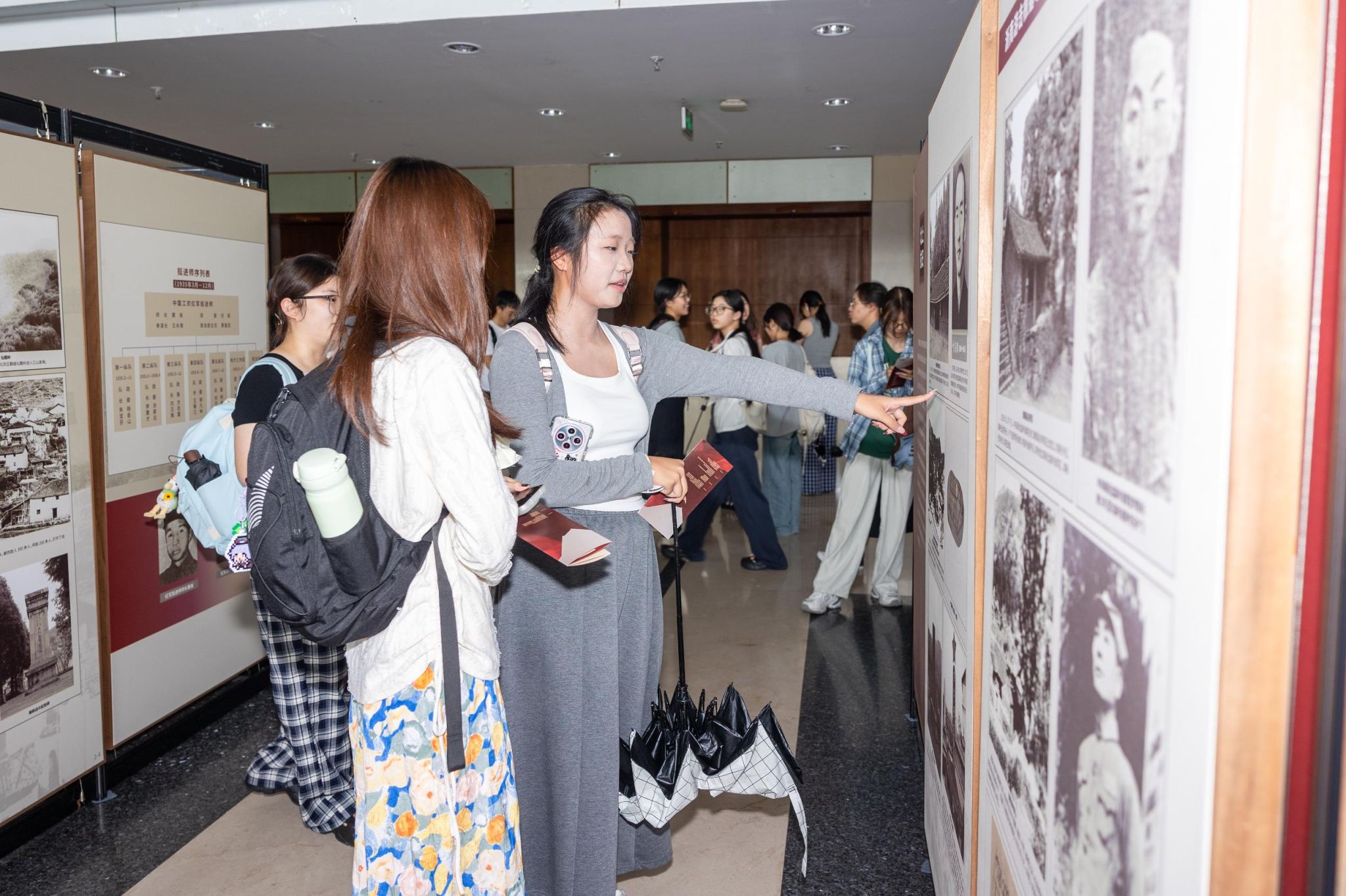 “這件新四軍蘇浙軍區對日本駐軍通牒是1945年8月11日由司令員粟裕、副司令員葉飛、政治委員譚振林、政治部副主任鐘期光聯合簽署的軍事文件。該通牒發布于日本宣布無條件投降前夕,標志著蘇浙軍區對日全面反攻的正式展開……”跟隨學校青年馬克思主義者協會宣講團的生動講述,在場的100余名師生重溫中國工農紅軍北上抗日先遣隊北上抗日、紅軍挺進師堅持斗爭的那段悲壯歷史,深刻感悟偉大抗戰精神,在特展現場沉浸式上了一堂行走的思政課。